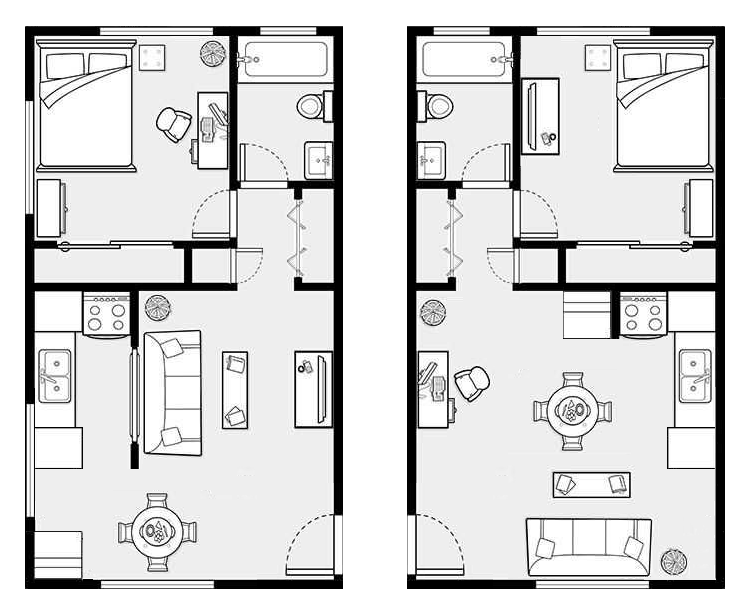 Persze nem ilyen bútorok vannak és nem ott, a konyhákba került a mosogató- és a mosógép is és a sötét lakásokban (jobb oldal) lebontották szerencsére a falat a konyha és a nappali között. Mivel nem kaptunk olyan rajzot, amin a lépcsőház is rajta van, ezért higgyük el, hogy lent van a bejárat, fent pedig a kijárat a kertbe. Ha egyszer befedetjük, akkor garázsba.